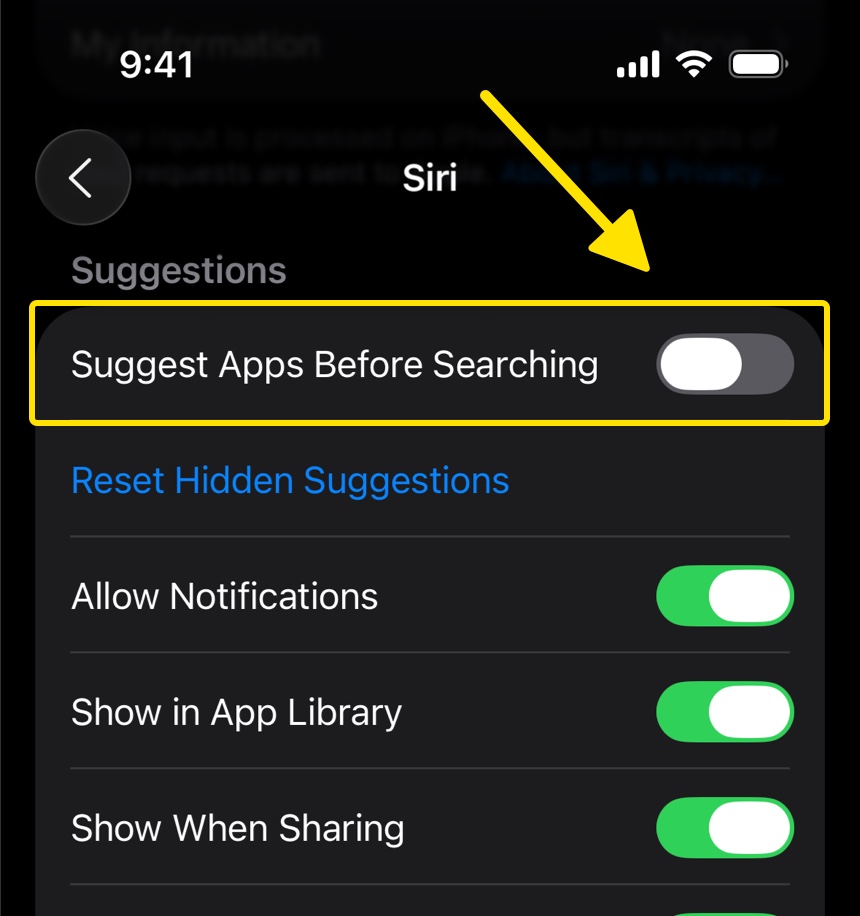 - Open the iOS Settings app → Siri (or Apple Intelligence & Siri)