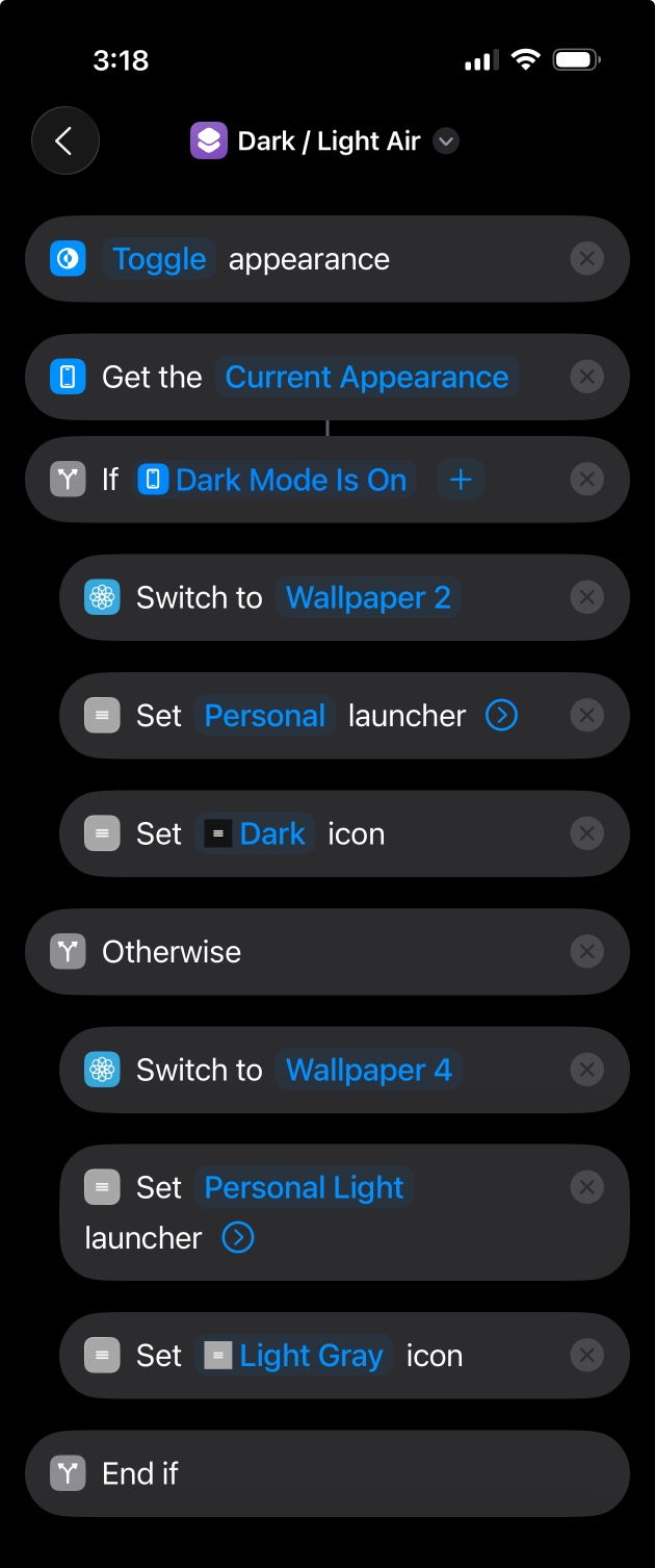 - Create a shortcut that includes the following actions, linking the created wallpapers to it